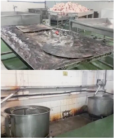 在现场,记者看到食品加工车间里,泡制区、修剪区、挑选区臭气弥漫,刺鼻的腥臭味让人作呕。生产环境脏乱不堪:地面长期淤积着浑浊污水,各类塑料筐杂乱无章随意堆放,生产机械设备表面污渍厚重、油污遍布。