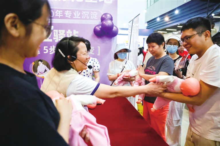 孕博会现场,市民不仅可选购高性价比的母婴用品,还能获得专业的孕产指导,更吸引人的是一系列“有趣、有用、有颜值”的互动活动:国风妆造让孕妈尽显别样风采,“120”急救课堂传递实用急救技能,奶爸“太空”闯关则让准爸爸们在趣味中解锁育儿本领。丰富的内容让备孕、待产、育儿的旅程更添轻松与暖意。