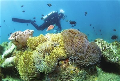 在海南三亚蜈支洲岛,工作人员正在“种植”珊瑚。他们把珊瑚的“断肢”,小心地固定在铁架苗圃上,等小珊瑚长大一些,再移种到海底。