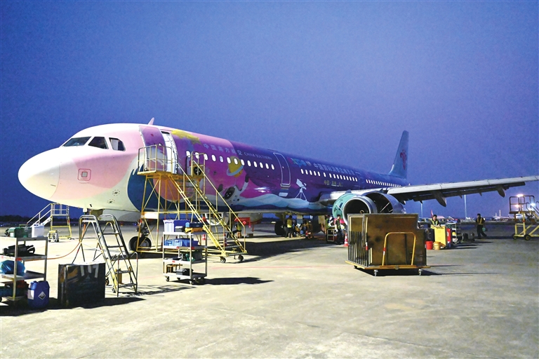 南国都市报4月5日讯(记者 丁文文 通讯员 王建勇 纪巧珠 武若男) 4月4日晚,海口美兰国际机场停机坪上,南航工程技术分公司机务工程师正对“消博号”彩绘飞机开展深度“体检”,确保飞机安全迎送第六届中国国际消费品博览会(以下简称“消博会”)参展旅客。