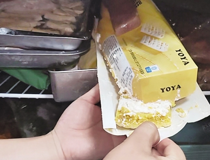 在原料库房内,执法人员进一步发现,用于食品制作的原材料、打包盒等成箱堆放在地上,杂乱无章,未按规定做到离地离墙30公分存放,存在原料污染隐患。“这些切好的鱼都是用于制作外卖的吧?”执法人员在操作台旁的冰柜内检查时发现,切好的三文鱼、金枪鱼、鹅肝装在同一个铁盘内,未用保鲜膜密封;冷食用的南瓜蛋挞外包装已破损,却与其他冷藏冷冻的预包装生食产品混放。装有鹅肝的铁盘内,一块切好的鱼肉上还附着一只蚊子。